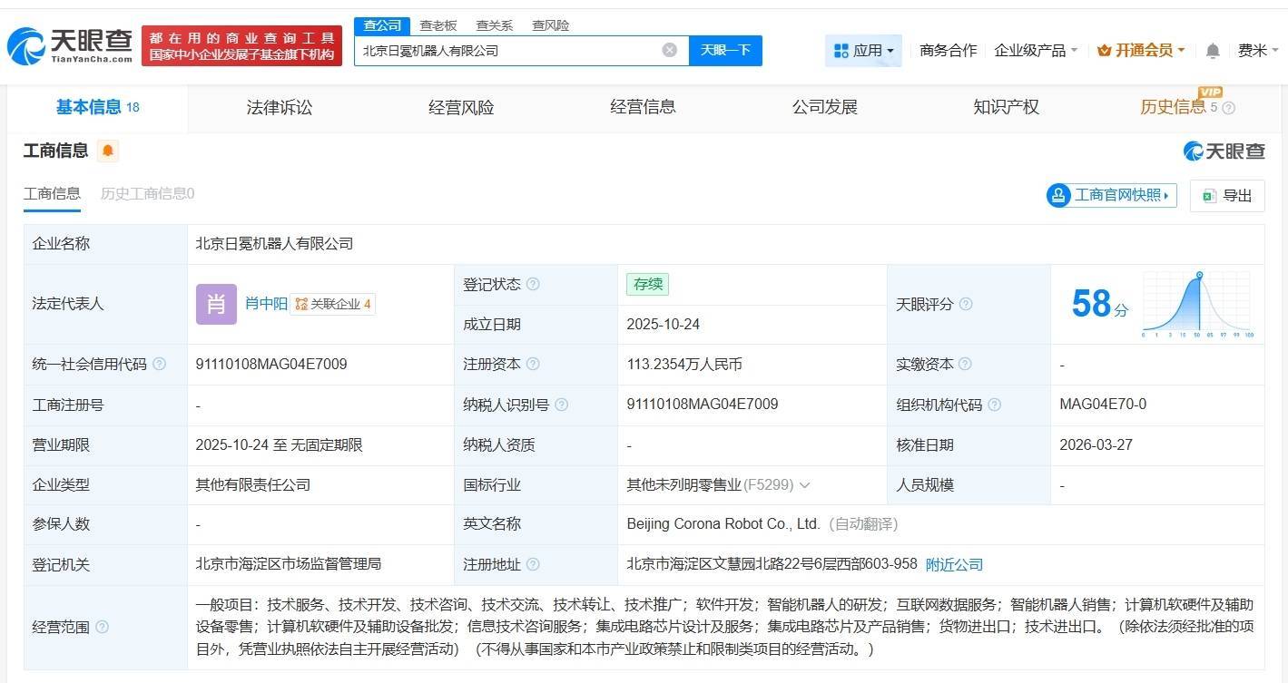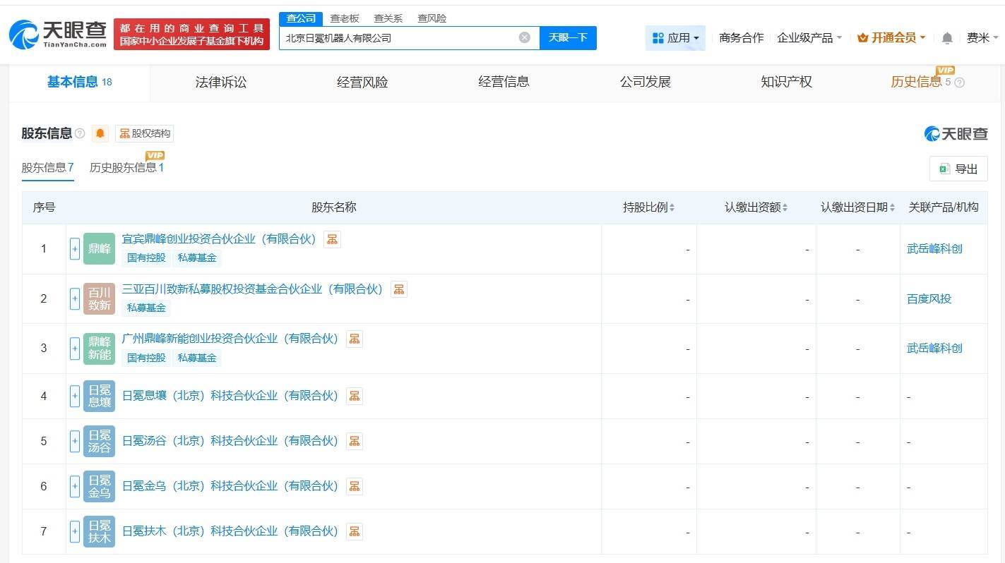 南方财经3月31日电,天眼查App显示,近日,北京日冕机器人有限公司发生工商变更,新增百度旗下三亚百川致新私募股权投资基金合伙企业(有限合伙)、宜宾鼎峰创业投资合伙企业(有限合伙)、广州鼎峰新能创业投资合伙企业(有限合伙)为股东,同时,注册资本由100万人民币增至约113.2万人民币。该公司成立于2025年10月,法定代表人为肖中阳,经营范围包括智能机器人的研发、互联网数据服务、智能机器人销售等,现由日冕息壤(北京)科技合伙企业(有限合伙)、日冕汤谷(北京)科技合伙企业(有限合伙)及上述新增股东等共同持股。据媒体报道,北京日冕机器人有限公司法定代表人肖中阳为前蔚来汽车世界模型交付负责人,其已于2026年初从蔚来离职,投身具身智能创业。
